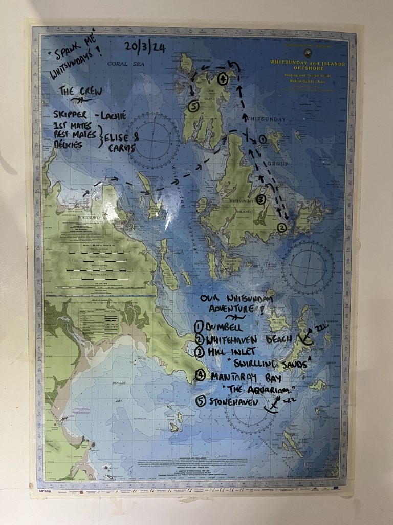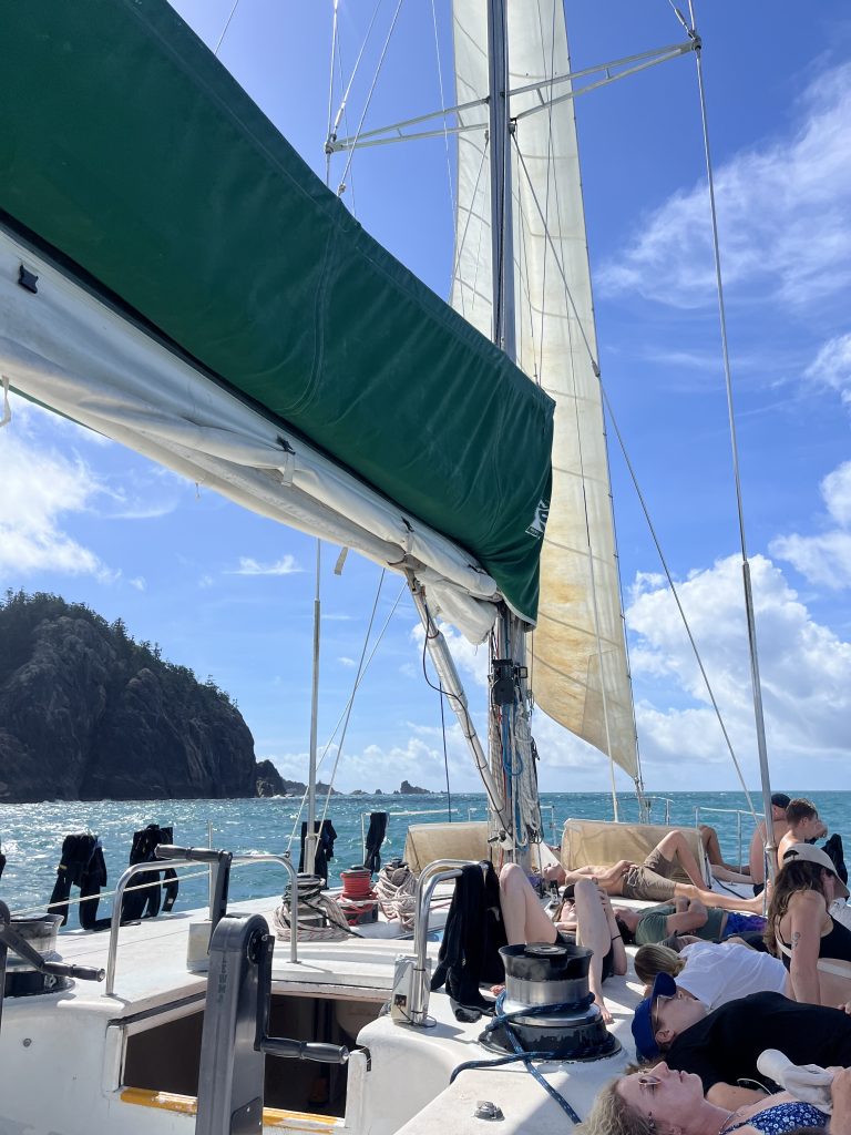 Al día siguiente, me embarqué en un velero para hacer un tour de 3 días/2 noches navegando por las Whitsundays. Sin duda, una de las experiencias que más estaba deseando hacer en este ‘road trip’ y que recordaré toda la vida. Es algo caro, yo reservé a través de Get Your Guide y me costó casi 300€, puedes también consultar los precios en las agencias en Airlie Beach. El precio incluye todas las comidas de esos 2 días, agua y el material necesario para hacer snorkel, solo deberás llevar tu propia bebida extra.